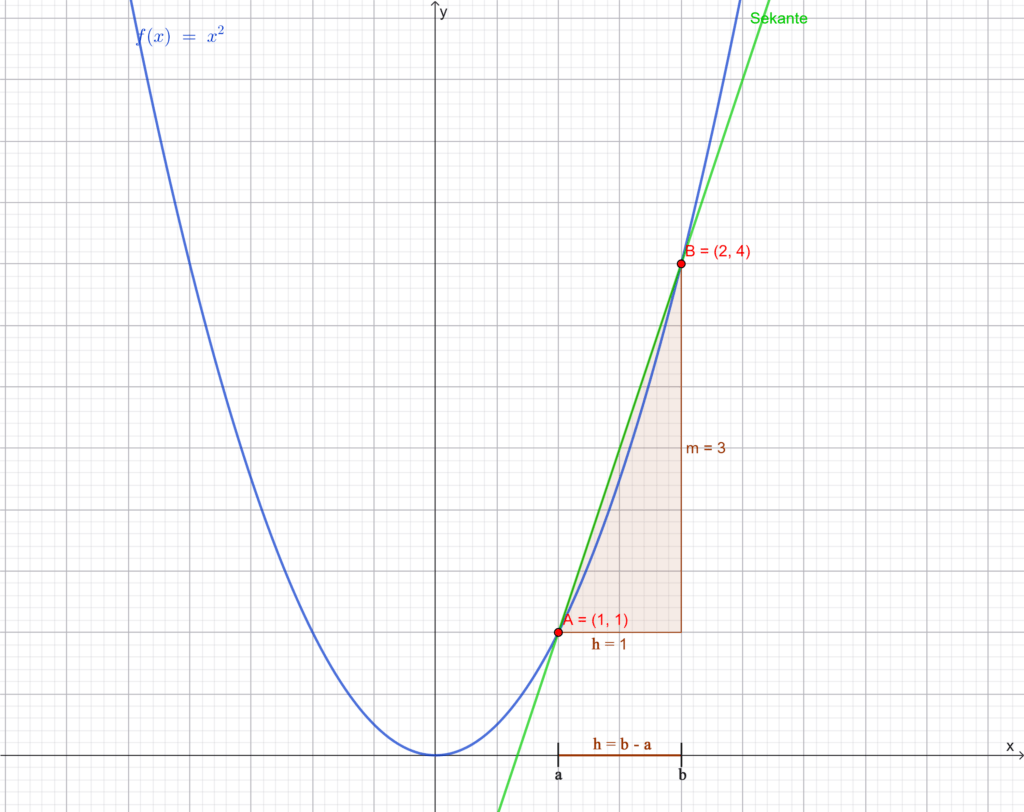 In dem Beitrag zur durchschnittlichen Änderungsrate haben wir diese anhand der Funktion \(f(x)=x^2\) zwischen den beiden Punkte \(A(1|1)\) und \(B(2|4)\) mit Hilfe des bestimmt Differenzenquotienten bestimmt: