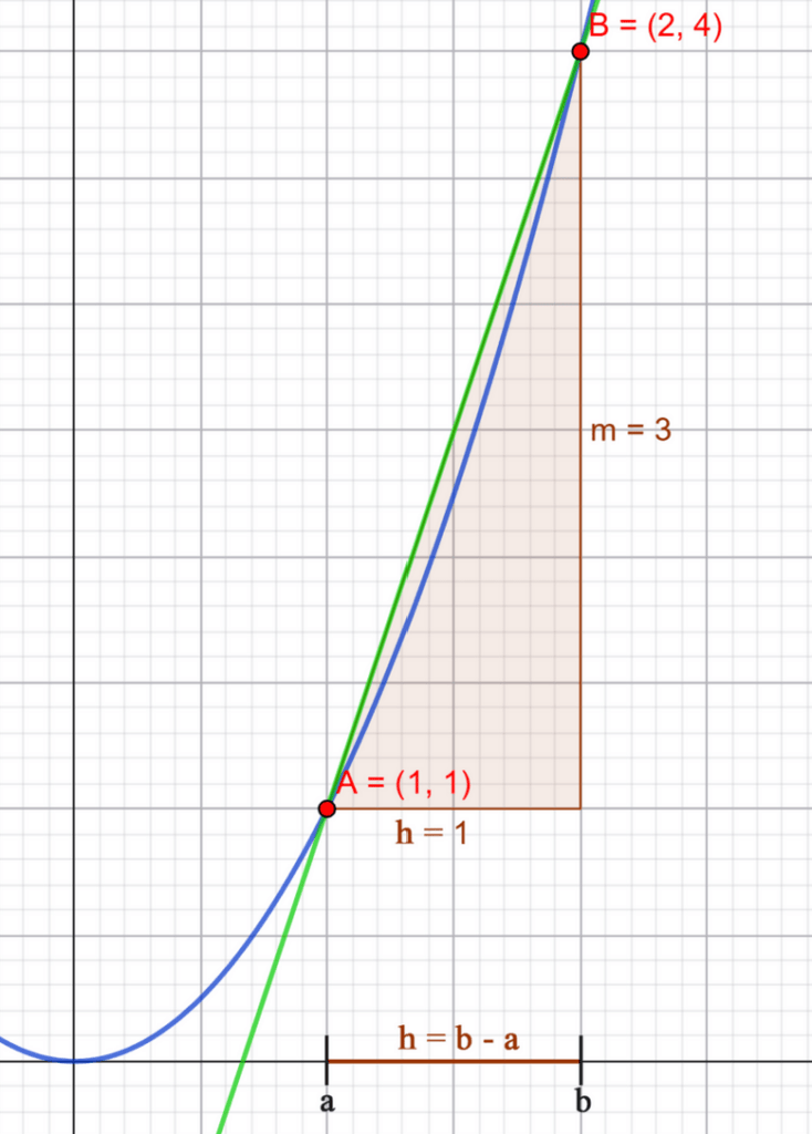 \[ m_{[1,2]} = \frac{f(2)-f(1)}{2-1} = \frac{4-1}{1} = 3. \]Damit haben wir die Steigung der Sekante zwischen den Punkten \(A\) und \(B\) bestimmt. Nun wollen wir jedoch die Steigung an exakt dem Punkt \(A\), also die lokale Änderungsrate, bestimmen.