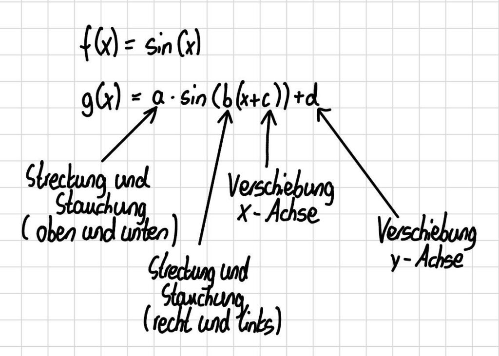 Die allgemeine Form der Sinusfunktion mit den vier Parametern \(a,b,c,d\) lautet: